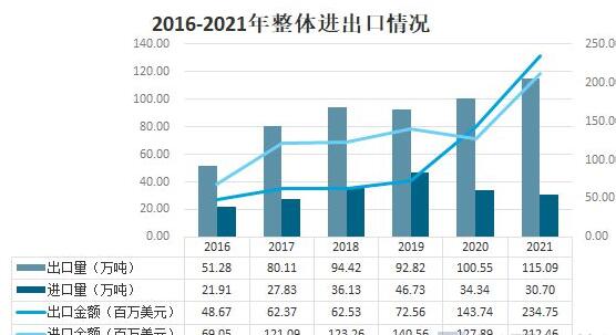 從全體上看,近兩年我國石英(天然砂在外)和石英巖(不管是否粗加修整或僅用鋸或其他辦法切割成矩形板或塊)出口量堅(jiān)持增加趨勢(shì),進(jìn)口量出現(xiàn)下滑,進(jìn)出口量存在較大差距,但進(jìn)口金額一度領(lǐng)先。2021年,我國共出口石英及石英巖115.09萬噸,出口金額為234.75百萬美元,共進(jìn)口石英及石英巖30.7萬噸,進(jìn)口金額為212.46百萬美元。